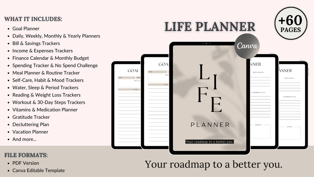 Life Planner PDF Version (+60 pages) - PDF file that contains the link to your planner canva template