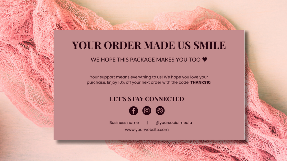 Express your appreciation in style with this elegant pink thank you card template. With a soft, minimalist design, this Canva-editable template is perfect for adding a personalized touch to your orders and showing customers how much they mean to you!