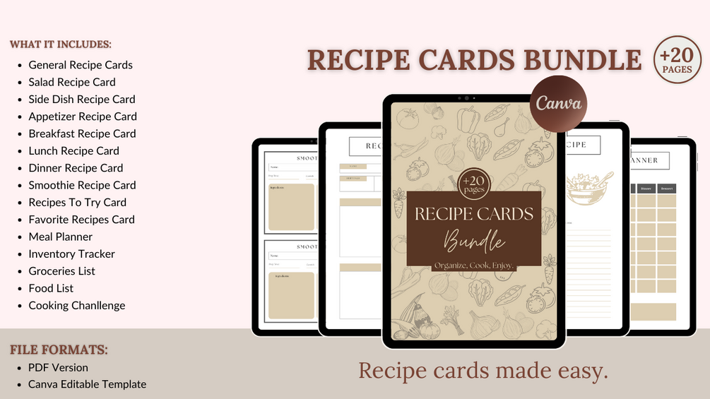 Get organized in the kitchen with this beautiful Recipe Card Bundle! Whether you're an aspiring chef or want to keep your favorite recipes neat and accessible, this bundle provides everything you need. Use the ready-to-go PDF version or customize the Canva template with your favorite colors and fonts. Add your personal touch or duplicate pages to fit your cooking style!